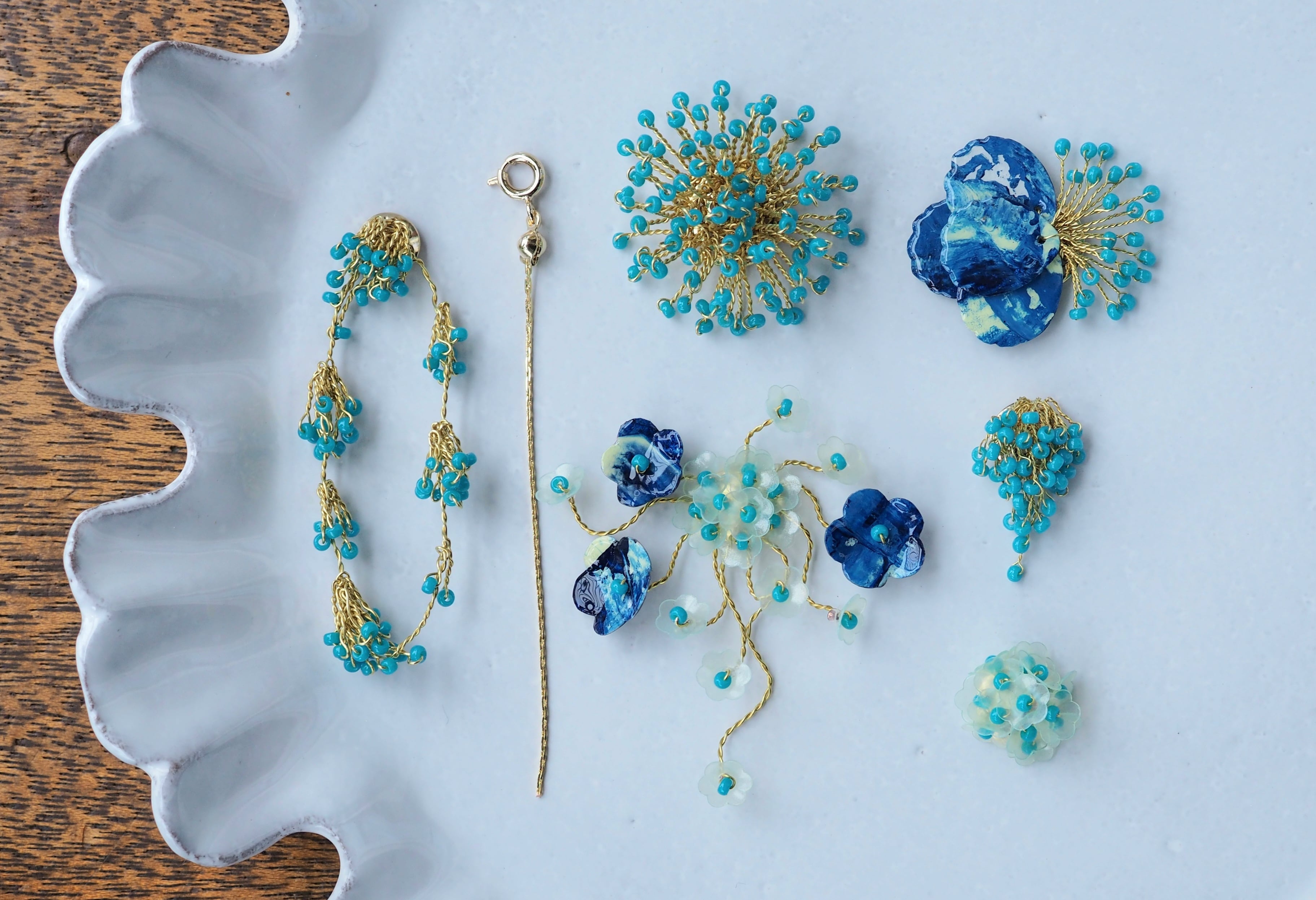 個性的なデザインや色使いと繊細なワイヤーワークがとても美しい一品です。
